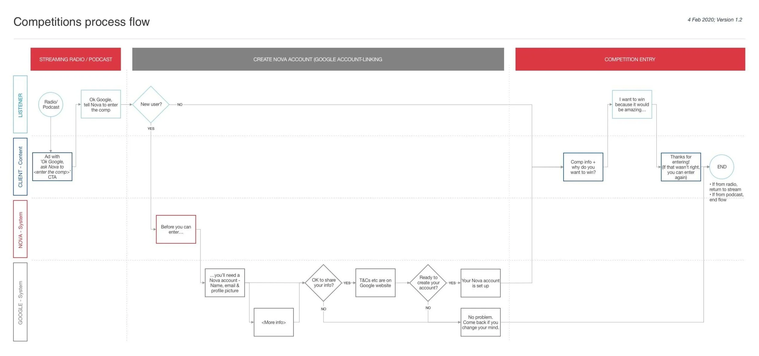 I was headhunted by Nova’s Chief Digital Officer to build the Experience Design team and lead the design of voice experiences from a HCD point of view. He had worked with me on another major design project in the past and believed I was best suited to take the practices of UX and apply them to the very new VUI space. I was to manage the UX team and also lead the smart speaker program of work. Initially there was no voice team except myself, but eventually Kathryn Sadler (VUI Designer) and Patrick Catanzariti (Software Engineer) joined Nova and we became an in-house voice delivery team.